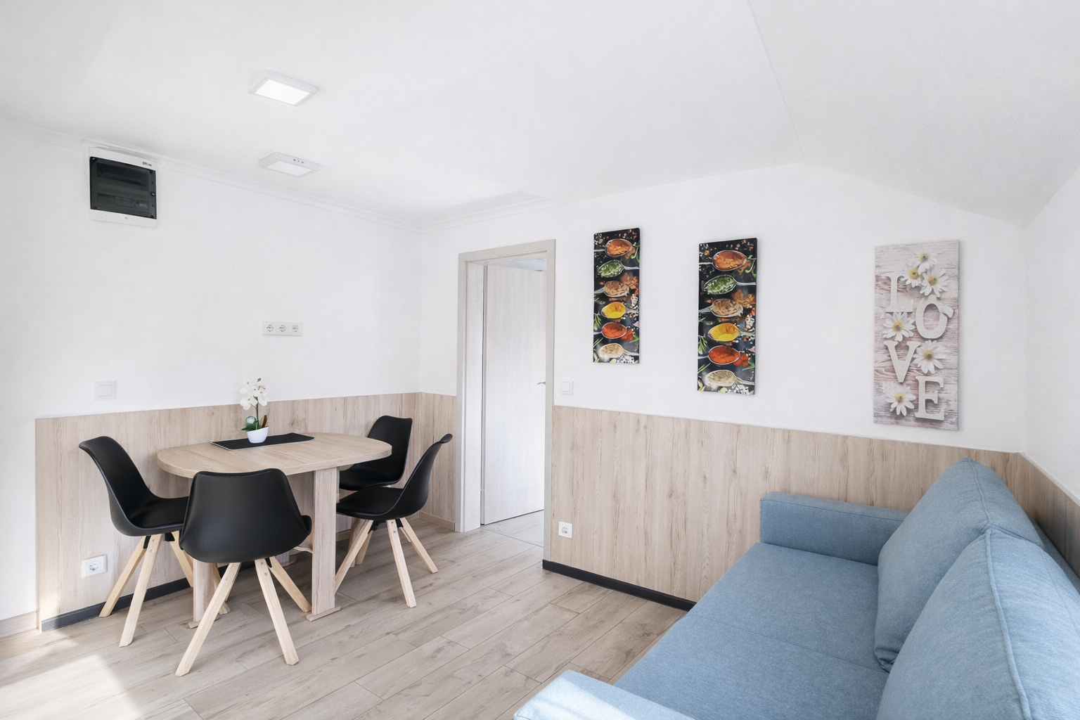 A nappalik kanapéággyal, kényelmes székekkel és ízléses berendezéssel várják vendégeinket.